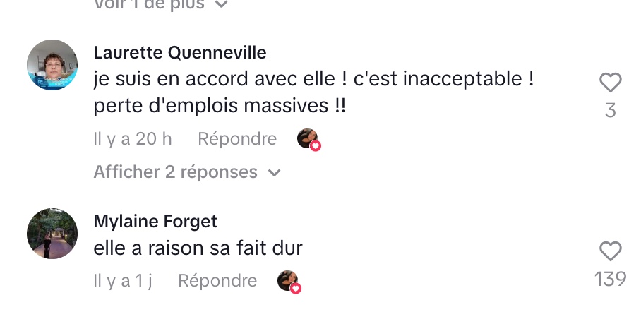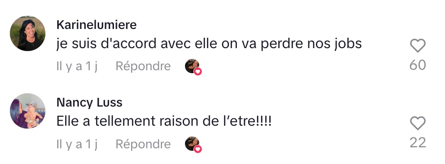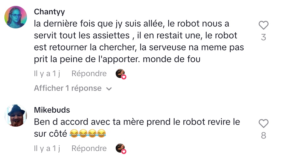 Dans les commentaires, plusieurs internautes partagent son indignation : « Elle a raison, moi je partirais », « C’est inacceptable, perte d’emplois massives ! » écrit-on. D’autres racontent des expériences similaires, où les robots ont apporté presque tous les plats sans que le personnel humain intervienne. Pour certains, cette automatisation illustre un « monde de fous » où la technologie prend peu à peu la place des travailleurs.