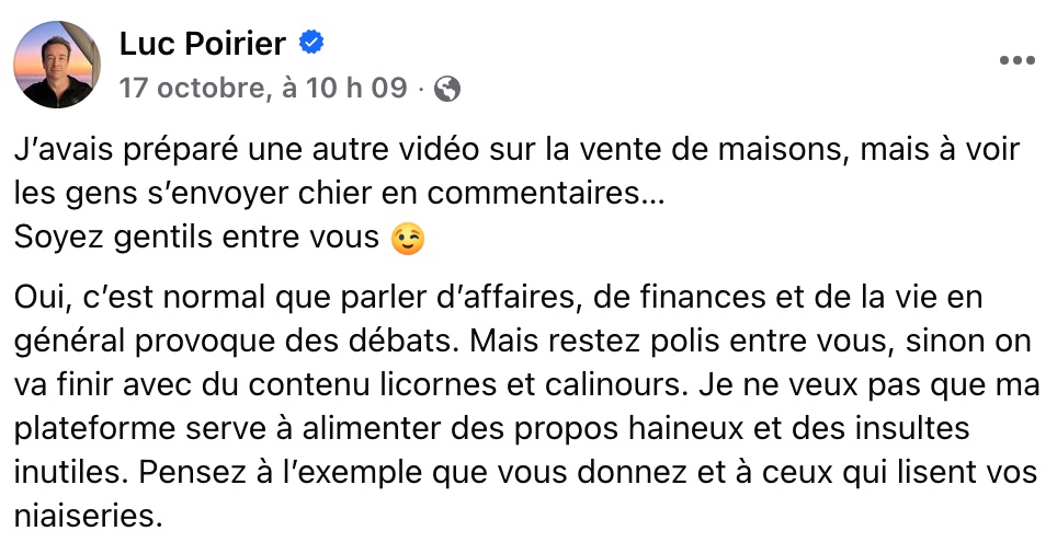 L’homme d’affaires Luc Poirier a tenu à remettre les pendules à l’heure dans une récente publication sur ses réseaux sociaux. Après avoir constaté des échanges virulents sous une de ses vidéos, il a décidé de prendre la parole pour appeler à plus de respect et de civisme. « Soyez gentils entre vous », écrit-il, tout en rappelant qu’il est normal que les discussions sur les affaires, les finances ou la société suscitent des débats.