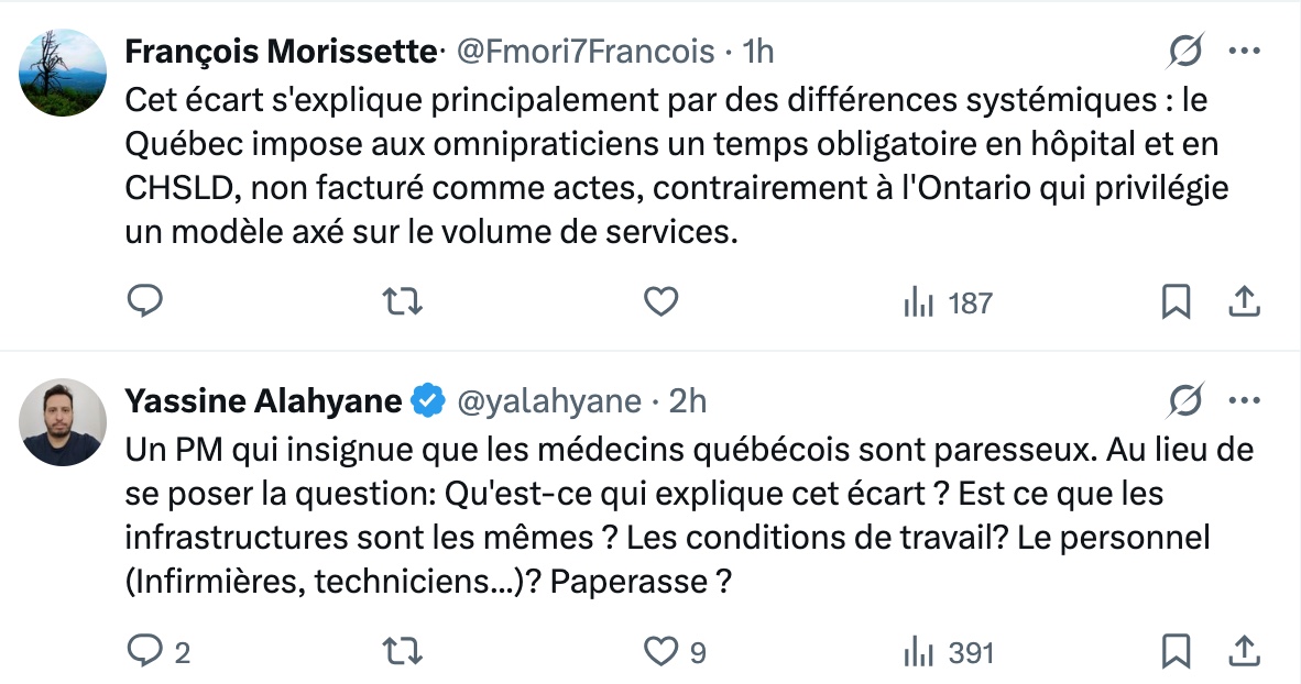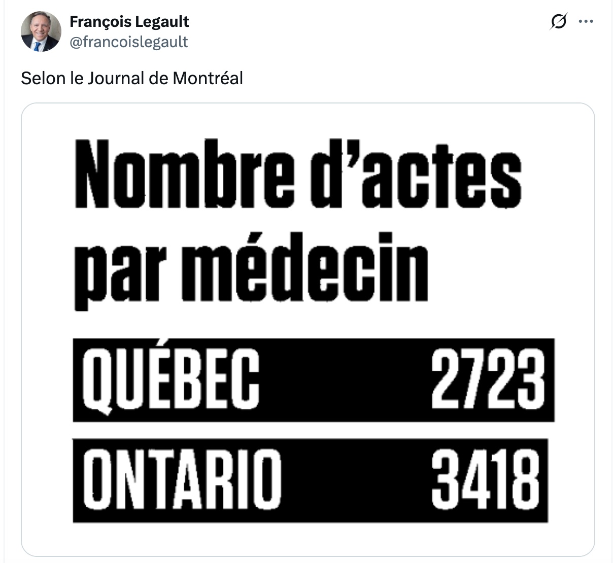 La publication du premier ministre du Québec, François Legault, comparant le nombre d’actes par médecin entre le Québec (2723) et l’Ontario (3418), a provoqué une vague de protestations parmi les médecins et les internautes. En citant le Journal de Montréal et en partageant cette statistique brute, M. Legault a été largement perçu comme insinuant une paresse ou un manque d’efficacité des médecins québécois, plutôt que d’analyser les causes systémiques de l’écart.