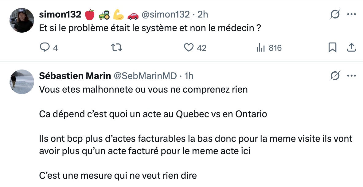 Les commentaires en ligne ont rapidement soulevé la non-comparabilité des chiffres. Le principal argument est que la définition d’un « acte » et les modalités de facturation diffèrent grandement entre la Régie de l’assurance maladie du Québec (RAMQ) et le Régime d’assurance-santé de l’Ontario (OHIP). Certains internautes ont souligné qu’en Ontario, une seule visite peut générer plusieurs actes facturables, ce qui n’est pas le cas au Québec.