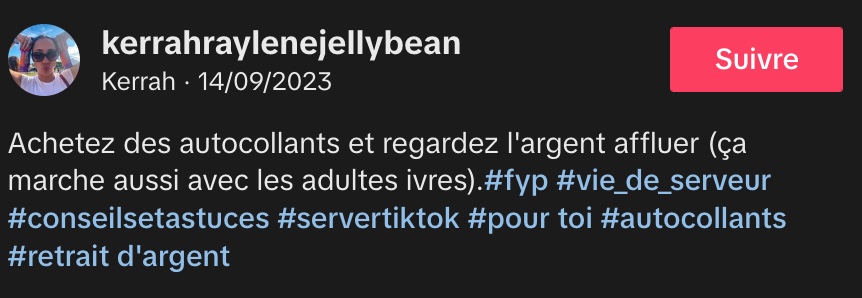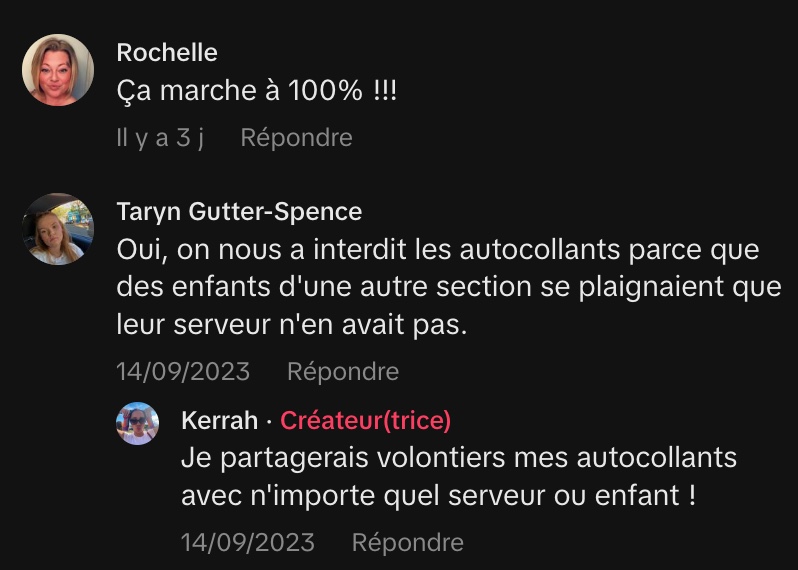 Dans sa vidéo TikTok, Kerrah révèle son astuce infaillible pour s’assurer un généreux pourboire de 25 % : offrir des autocollants aux enfants. Selon elle, puisque tous les serveurs travaillent pour l’argent, il est temps d’arrêter de garder ce secret.