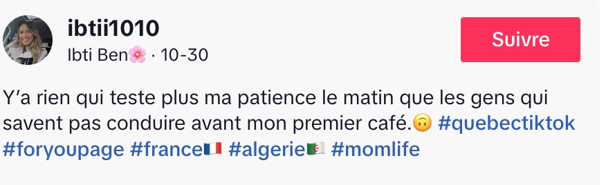 @ibtii1010 Y’a rien qui teste plus ma patience le matin que les gens qui savent pas conduire avant mon premier café.🙃 #quebectiktok #foryoupage #france🇫🇷 #algerie🇩🇿 #momlife ♬ son original – Ibti Ben🌸