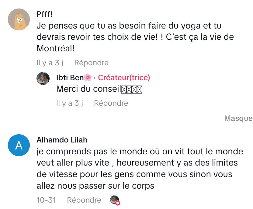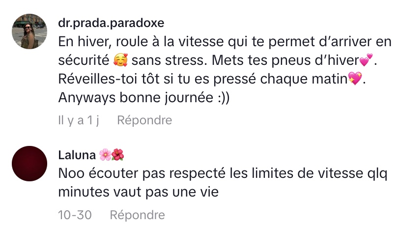 Des conseils pratiques, comme de se réveiller plus tôt ou d’adapter sa conduite à l’hiver, lui sont adressés, rappelant que la sécurité et le « sans stress » devraient primer sur la précipitation. Ce TikTok devient ainsi un miroir de la tension quotidienne entre le rythme de vie effréné et la nécessité d’une conduite responsable et sécuritaire.