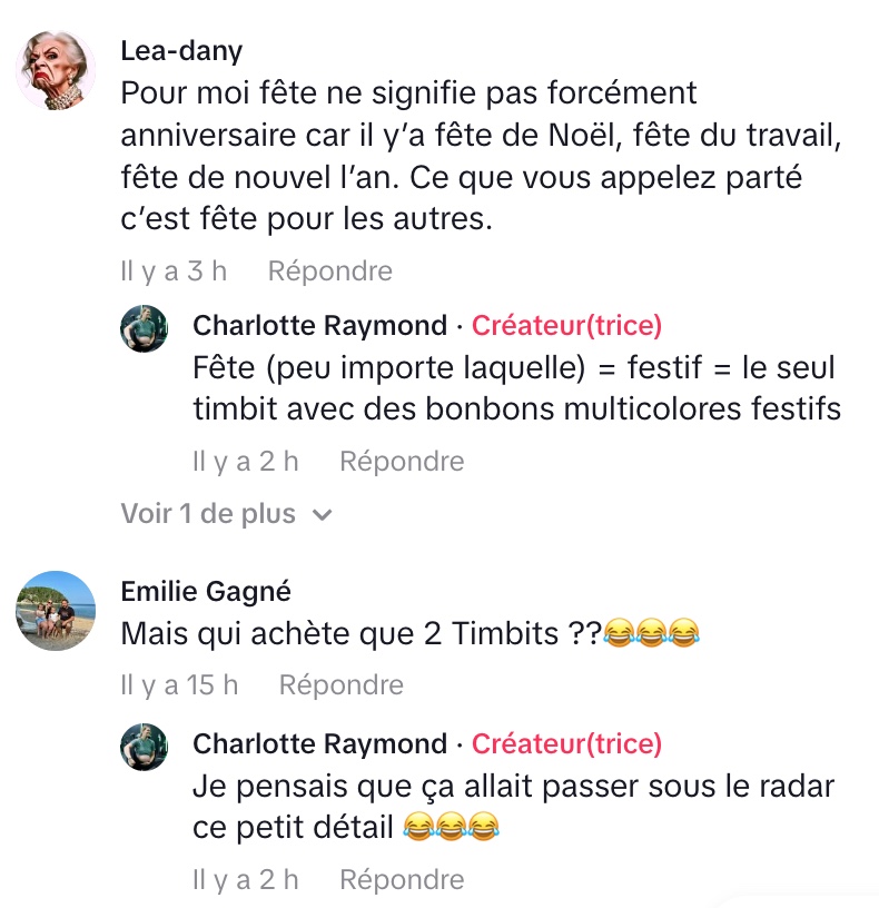 L’internaute suggère ainsi que les deux termes devraient être acceptés. Enfin, certains ont simplement été déconcertés par la petite quantité, demandant : « Mais qui achète que 2 Timbits ?? » Cette simple histoire de Timbits montre comment une petite variation de vocabulaire peut devenir un sujet viral, soulignant les différences régionales et le pouvoir du « petit stop » au Tim Hortons dans la culture populaire.