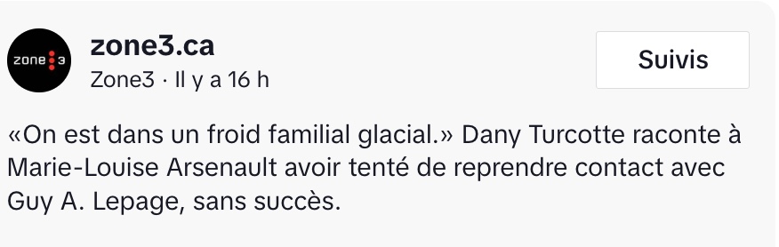 @zone3.ca «On est dans un froid familial glacial.» Dany Turcotte raconte à Marie-Louise Arsenault avoir tenté de reprendre contact avec Guy A. Lepage, sans succès. Voyez ou revoyez le passage de Dany Turcotte à Dans les médias sur le site web de @Télé-Québec #danyturcotte #guyalepage #toutlemondeenparle ♬ son original – Zone3
