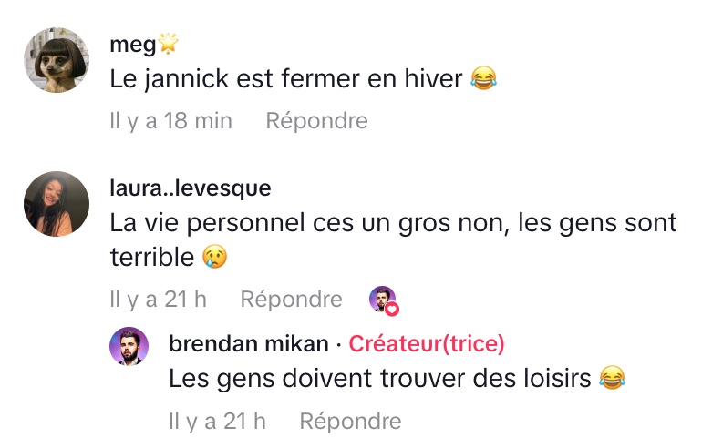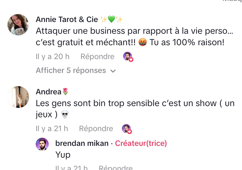 Dans sa vidéo TikTok, Brendan Mikan exprime un profond découragement devant le comportement de certains internautes. Il explique avoir constaté, juste après la diffusion d’un épisode d’Occupation Double, une avalanche de critiques négatives publiées sur Google à propos du restaurant dont Arnaud est copropriétaire.