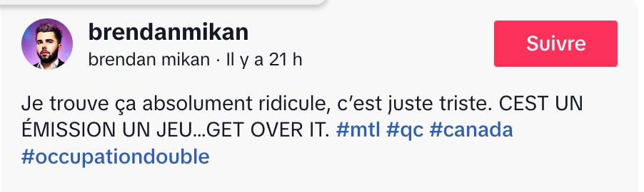 @brendanmikan Je trouve ça absolument ridicule, c’est juste triste. CEST UN ÉMISSION UN JEU…GET OVER IT. #mtl #qc #canada #occupationdouble ♬ original sound – brendan mikan