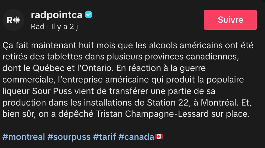 @radpointca Ça fait maintenant huit mois que les alcools américains ont été retirés des tablettes dans plusieurs provinces canadiennes, dont le Québec et l’Ontario. En réaction à la guerre commerciale, l’entreprise américaine qui produit la populaire liqueur Sour Puss vient de transférer une partie de sa production dans les installations de Station 22, à Montréal. Et, bien sûr, on a dépêché Tristan Champagne-Lessard sur place. #montreal #sourpuss #tarif #canada🇨🇦 ♬ son original – Rad