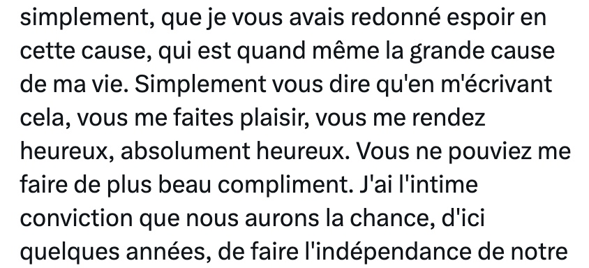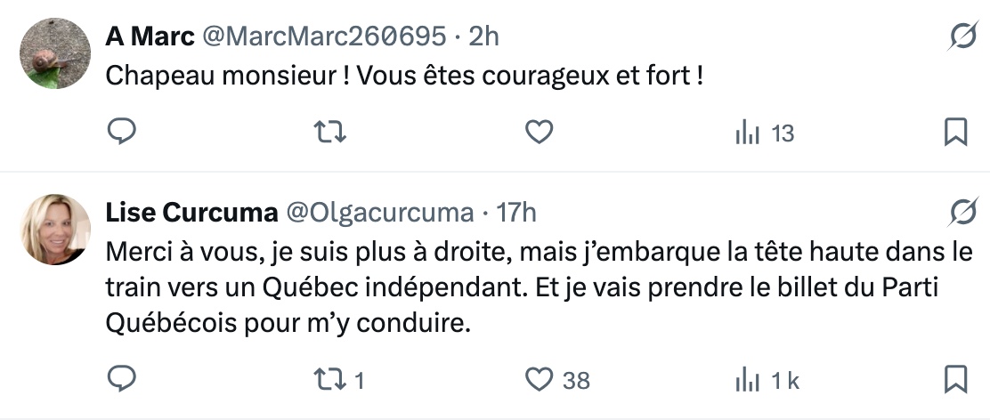 Il souligne que beaucoup de ces messages lui ont exprimé qu’il leur avait redonné l’envie de devenir indépendantiste, ou de retrouver l’espoir en cette cause qu’il qualifie de « grande cause de [sa] vie. » Il se dit absolument heureux de recevoir de tels compliments, affirmant que c’est le plus beau qu’on puisse lui faire.