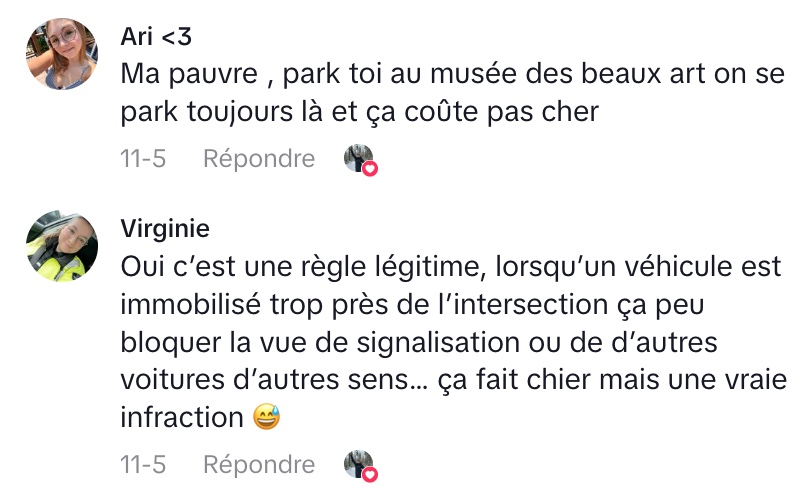 Malgré toute sa vigilance et ses efforts pour s’assurer d’être en règle cette fois-ci, elle a découvert un ticket sur son véhicule. L’infraction spécifiée était l’immobilisation à moins de 5 mètres d’une intersection. Gabrielle, visiblement abattue, confie qu’elle ignorait complètement cette règle. Elle pensait qu’il suffisait de ne pas bloquer le passage ou de ne pas dépasser la rue.