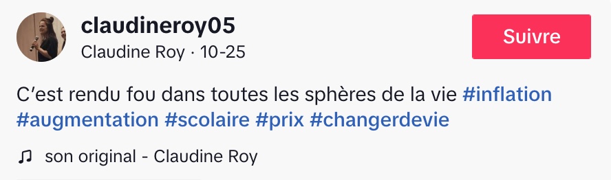 @claudineroy05 C’est rendu fou dans toutes les sphères de la vie #inflation #augmentation #scolaire #prix #changerdevie ♬ son original – Claudine Roy