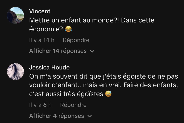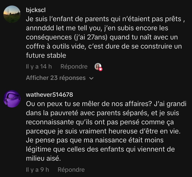 Melissa exprime une vive frustration face aux personnes qui font des enfants « juste pour faire des enfants », sans tenir compte de leur situation. Elle insiste sur le fait que la parentalité nécessite une stabilité financière et résidentielle, ainsi qu’un partenariat établi. Selon elle, mettre au monde un enfant dans la précarité, c’est lui imposer des difficultés dès le départ, ce qu’elle juge inconscient et égoïste.