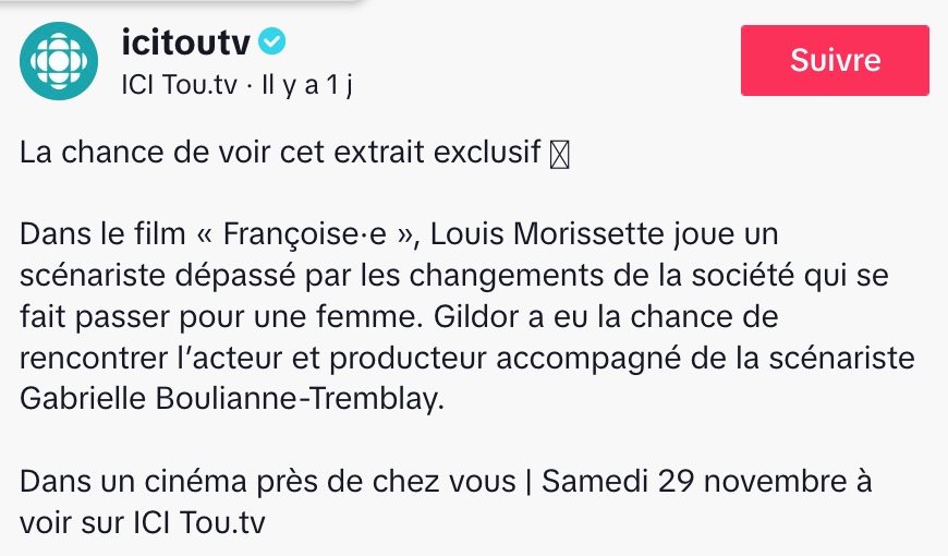 @icitoutvLa chance de voir cet extrait exclusif 🥹 Dans le film « Françoise·e », Louis Morissette joue un scénariste dépassé par les changements de la société qui se fait passer pour une femme. Gildor a eu la chance de rencontrer l’acteur et producteur accompagné de la scénariste Gabrielle Boulianne-Tremblay. Dans un cinéma près de chez vous | Samedi 29 novembre à voir sur ICI Tou.tv♬ son original – ICI Tou.tv