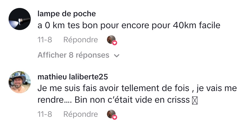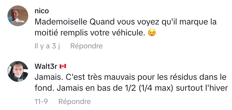 Dans son TikTok, Mika partage avec humour et anxiété son éternelle procrastination face à l’essence. Elle se demande si elle est la seule à attendre la dernière minute pour faire le plein, pour le regretter aussitôt. Sa méthode de gestion est de se fier entièrement au kilométrage restant affiché par sa voiture, une stratégie qui lui joue constamment des tours.