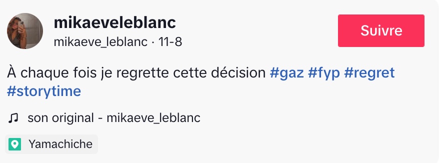 @mikaeveleblanc À chaque fois je regrette cette décision #gaz #fyp #regret #storytime ♬ son original – mikaeve_leblanc