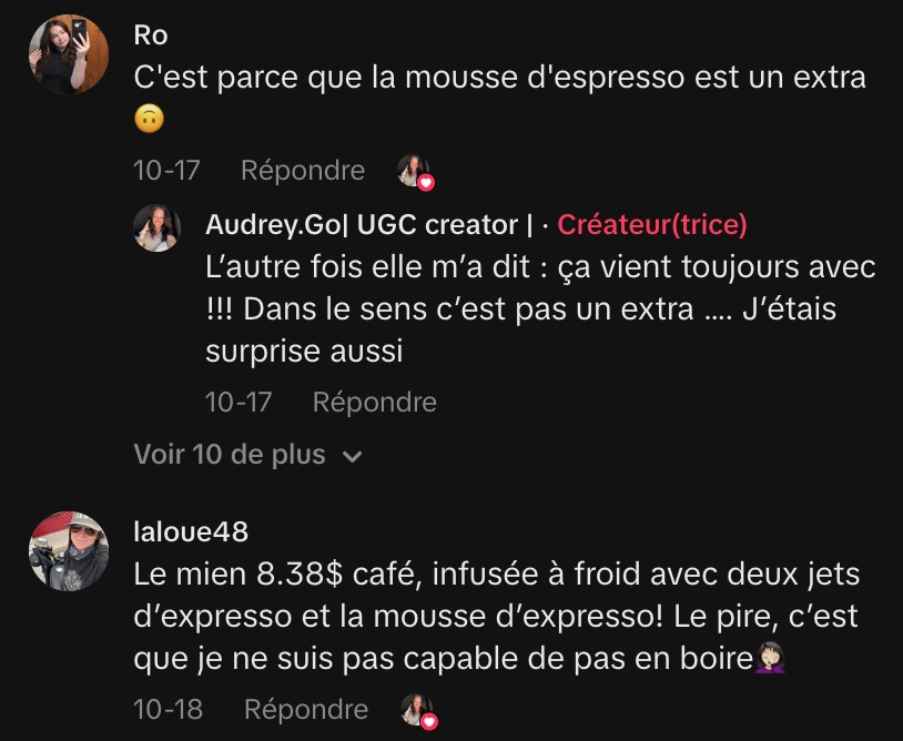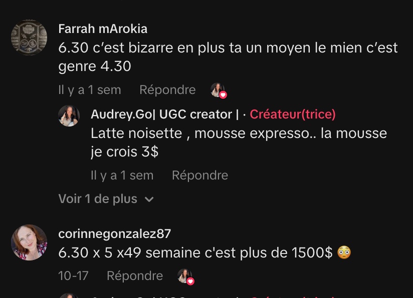 Dans son TikTok, Audrey exprime son choc face au prix de son café quotidien, un latté glacé noisette avec mousse d’espresso. Elle révèle payer $6,30 pour cette boisson qu’elle juge « vraiment bonne » et qu’elle commande presque tous les matins.