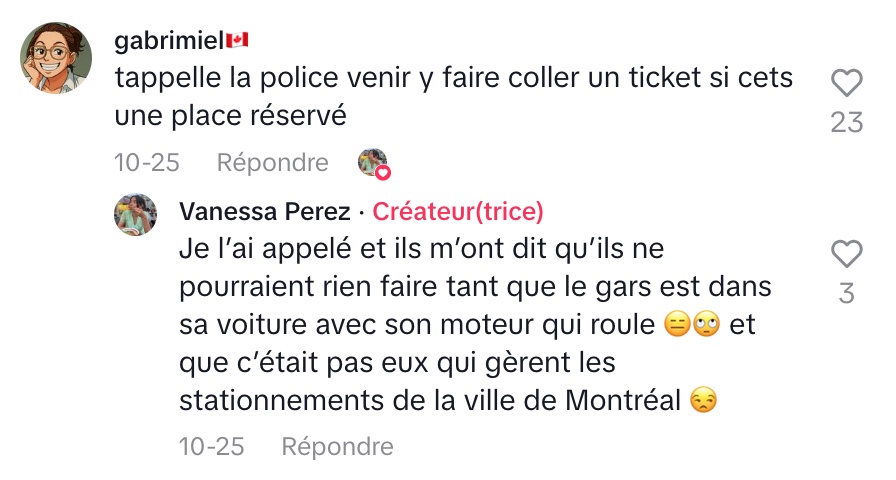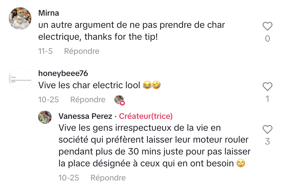 Elle le qualifie de « connard » et de « petit con » pour son manque total de respect envers les besoins des autres utilisateurs de VÉ. Elle conclut en filmant sa voiture, déplorant l’existence de personnes aussi peu civiques.