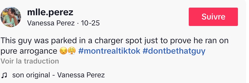 @mlle.perez This guy was parked in a charger spot just to prove he ran on pure arrogance 😒😤 #montrealtiktok #dontbethatguy ♬ son original – Vanessa Perez