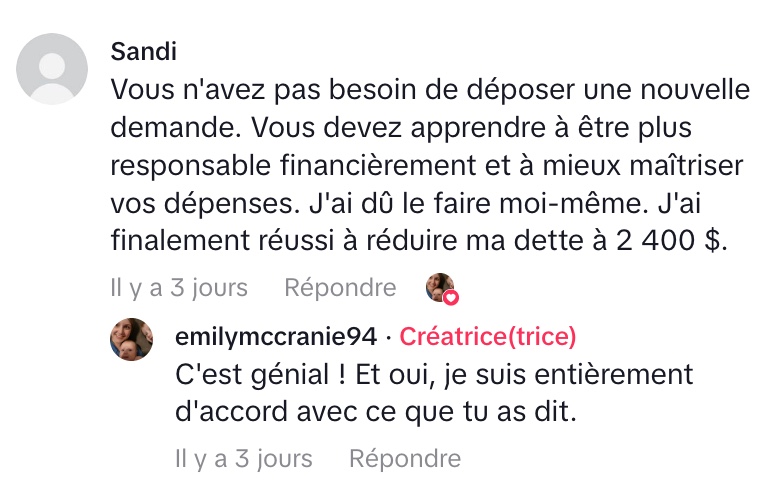 Elle a détaillé l’origine de ce fardeau, qui inclut le coût combiné de leurs deux véhicules (41 216 $), des prêts contractés avec son conjoint (32 715 $), ainsi que des emprunts pour l’achat de meubles et de téléphones, totalisant 18 618 $. Elle a souligné que même les « petites dettes » mensuelles s’accumulent très rapidement, transformant la gestion financière en un véritable cercle vicieux et un « combat constant. »