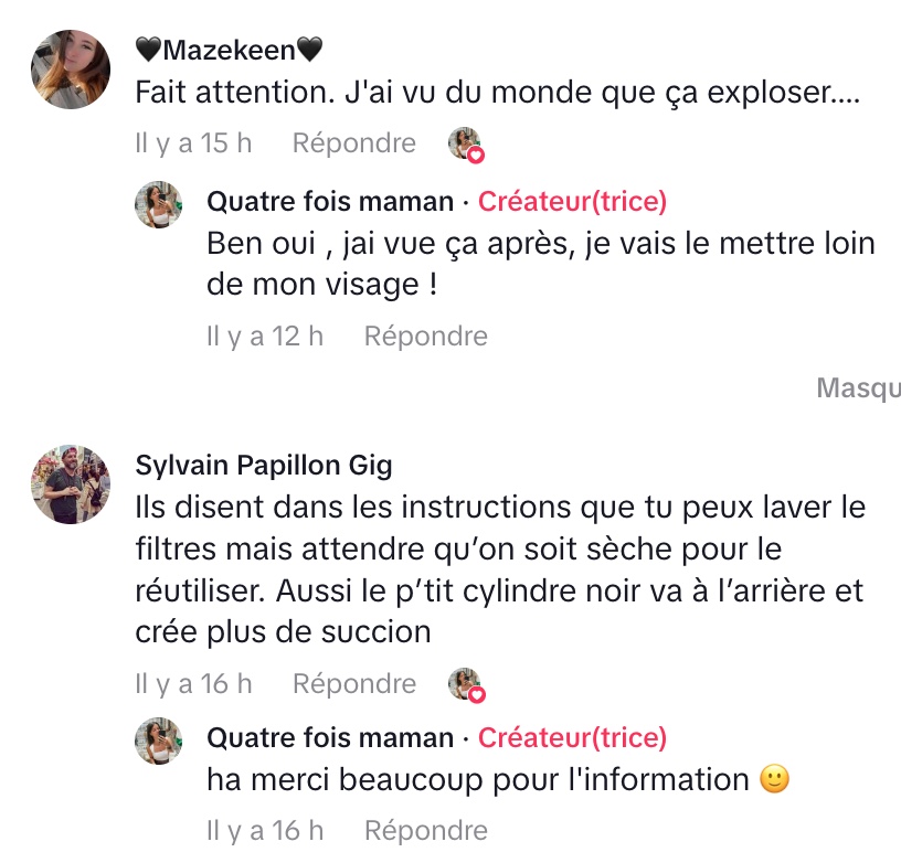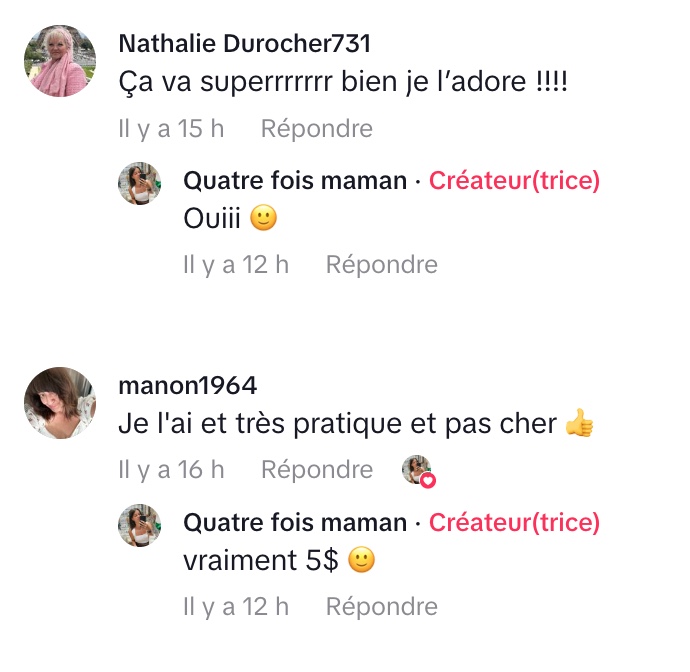 Bien que sa voiture soit neuve et peu sale, elle est impressionnée par la puissance d’aspiration, notant que l’utilisation d’un embout rend l’aspiration « vraiment mieux. » En conclusion, « 4 Fois Maman » estime que l’aspirateur, même avec un filtre potentiellement difficile à remplacer à terme, est un excellent achat pour 5 $, offrant un excellent rapport qualité-prix. Elle recommande donc l’article à ses abonnés.