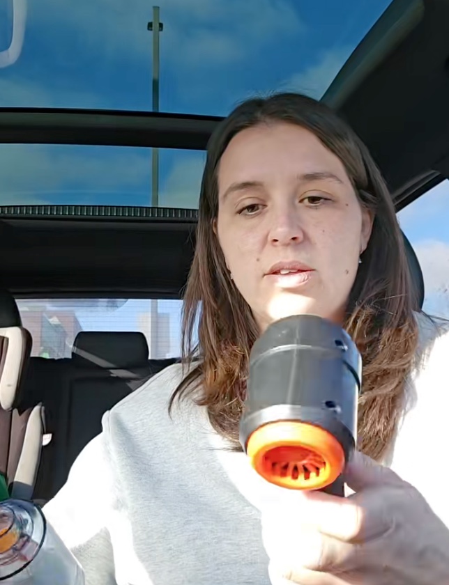 Le kit, qui se branche sur la voiture, comprend l’aspirateur lui-même et plusieurs embouts qu’elle compare humoristiquement à une « aérochambre pour les pompes ». Après avoir rapidement assemblé les pièces, elle teste l’appareil sur la poussière et les débris présents dans son véhicule.