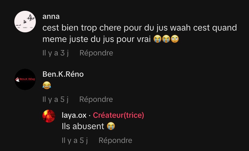 Layla conclut en demandant à ses abonnés s’ils trouvent, comme elle, que 20 $ pour un mocktail est un prix abusif. Son message soulève un débat sur la valeur réelle des boissons sans alcool dans l’industrie de la restauration.