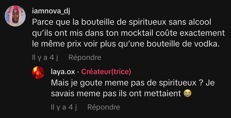 Pour Layla, un mocktail n’est rien de plus qu’un « jus » une simple combinaison de jus Oasis mélangés ensemble qui ne justifie absolument pas un tel coût. Elle raconte avoir payé 40 $ pour deux mocktails lors de sa dernière sortie, une dépense qu’elle trouve totalement disproportionnée pour du « jus ».