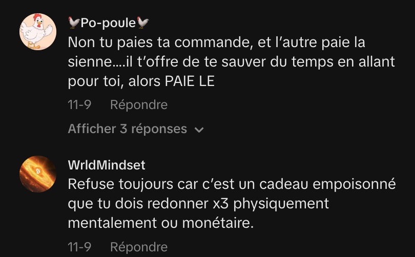 Asmaa se demande : « What was the reason ? » Pour elle, la question initiale (« veux-tu quelque chose ? ») implique fondamentalement que la chose sera offerte. Si l’intention était d’acheter pour elle, la formulation aurait dû être : « Voudrais-tu que j’achète quelque chose pour toi, puis tu me rembourseras ? »