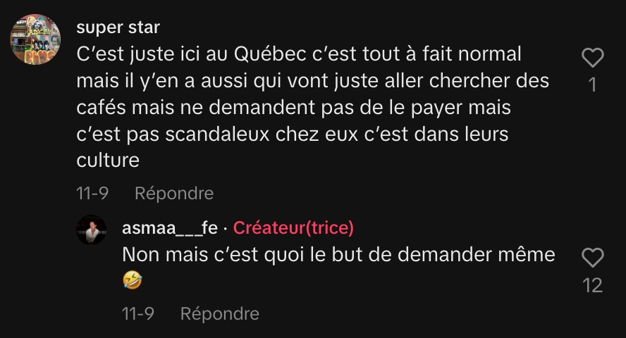 Le problème se pose quand un collègue lui demande : « Est-ce que tu veux quelque chose ? » avant de se rendre à un café comme le Tim Hortons. Asmaa, acceptant l’offre, demande un café vanille française. L’étonnement arrive au retour du collègue, qui lui demande alors de lui remettre 2,50 $.