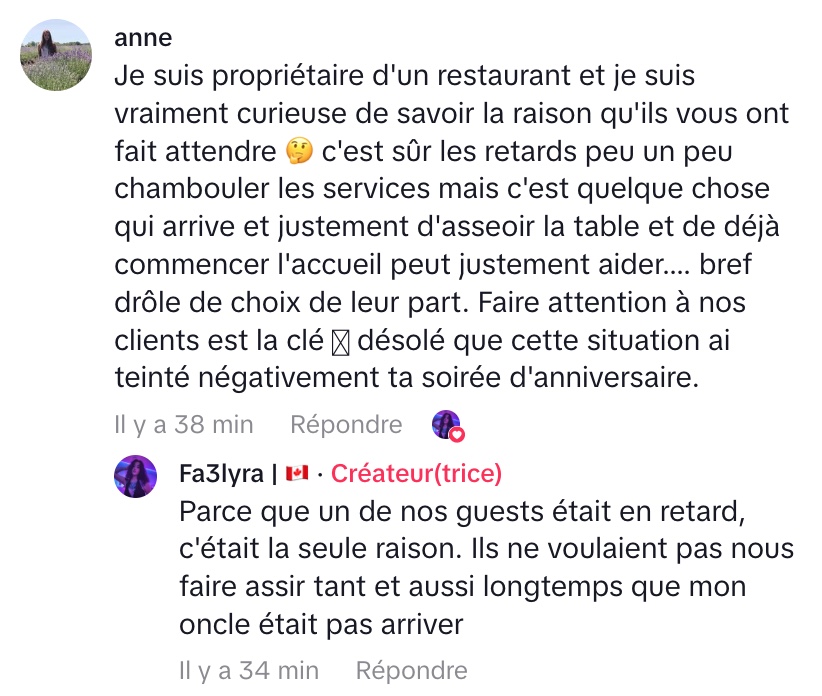 Sur TikTok, fa3lyraa a partagé une expérience de restaurant qu’elle qualifie comme « le pire service de toute sa vie ». Dans sa vidéo, elle raconte être allée chez Toyo Grillades à la japonaise, à Laval, pour souligner son 30e anniversaire avec sa famille. Dès leur arrivée, l’ambiance aurait été tendue, puisqu’un membre du groupe était en retard en raison de la mauvaise température et du trafic intense causé par les déneigeuses. Le personnel aurait refusé de les asseoir tant que tout le groupe n’était pas arrivé, et l’échange avec l’hôtesse serait rapidement devenu froid et déplacé.