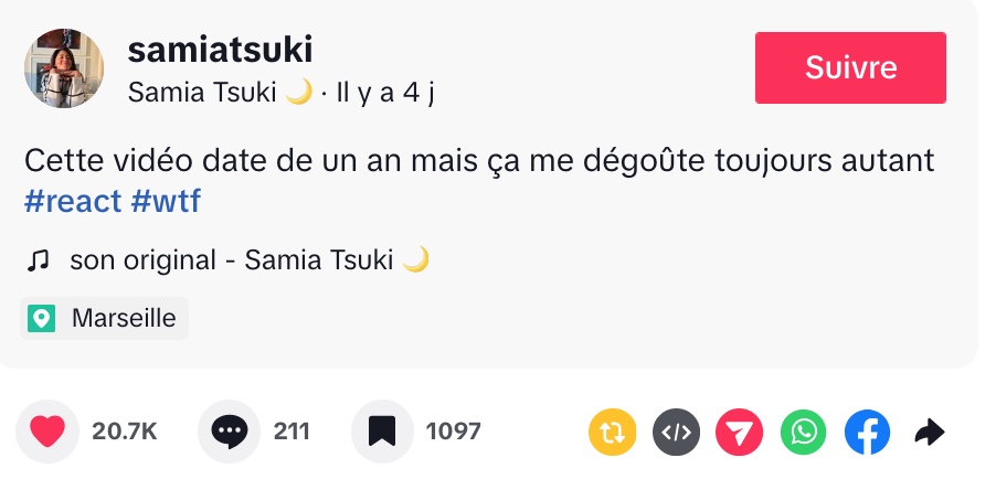 @samiatsuki Cette vidéo date de un an mais ça me dégoûte toujours autant #react #wtf ♬ son original – Samia Tsuki 🌙