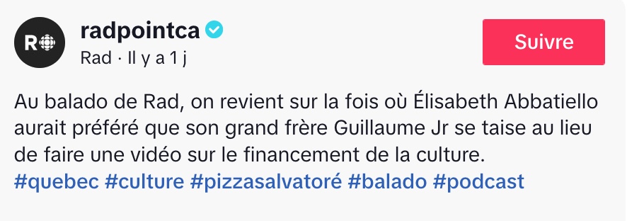 @radpointca Au balado de Rad, on revient sur la fois où Élisabeth Abbatiello aurait préféré que son grand frère Guillaume Jr se taise au lieu de faire une vidéo sur le financement de la culture. #quebec #culture #pizzasalvatoré #balado #podcast ♬ son original – Rad