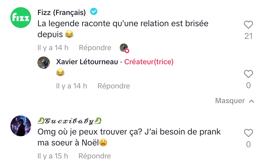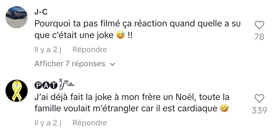 Pendant tout ce temps, Xavier joue le jeu à fond, faisant semblant que le gain est réel, même s’il sait très bien que le billet est truqué. Dans les commentaires, les internautes sont partagés : certains trouvent la blague vraiment méchante, d’autres la trouvent hilarante. On peut lire : « C’est vraiment pas correct faire ça », « On veut voir la suite », ou encore « Il a dû dormir sur le sofa cette nuit 😂 », et « Tellement pas correct, mais tellement drôle ».