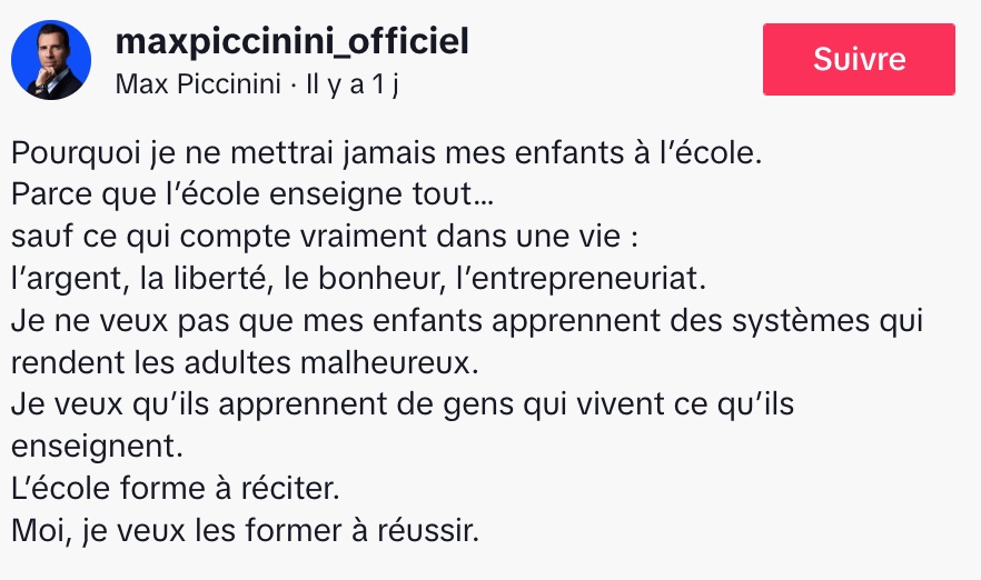 @maxpiccinini_officielPourquoi je ne mettrai jamais mes enfants à l’école. Parce que l’école enseigne tout… sauf ce qui compte vraiment dans une vie : l’argent, la liberté, le bonheur, l’entrepreneuriat. Je ne veux pas que mes enfants apprennent des systèmes qui rendent les adultes malheureux. Je veux qu’ils apprennent de gens qui vivent ce qu’ils enseignent. L’école forme à réciter. Moi, je veux les former à réussir.♬ original sound – Max Piccinini