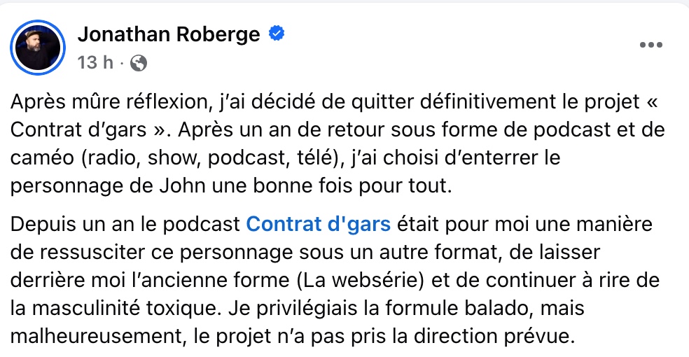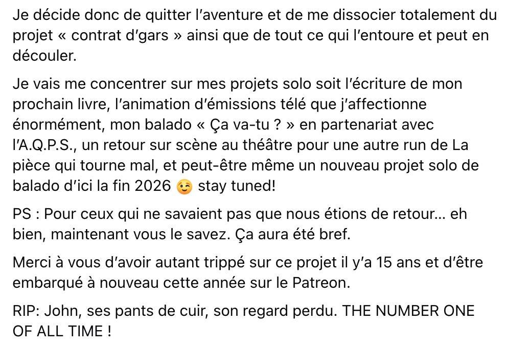 Jonathan Roberge signe un virage clair et assumé en annonçant qu’il quitte définitivement le projet « Contrat d’gars » et qu’il enterre le personnage de John. Dans sa publication, on sent à la fois la lucidité et une certaine tendresse pour ce rôle culte qui a marqué toute une génération. Après avoir tenté de faire renaître l’univers sous une nouvelle forme, plus moderne, à travers le balado et diverses apparitions médiatiques, l’humoriste reconnaît que le projet n’a pas évolué dans la direction qu’il souhaitait.