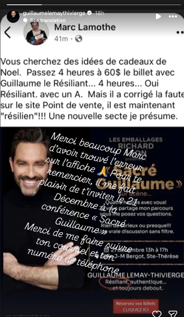 Face à cette remarque moqueuse, Guillaume n’a pourtant ni répliqué avec colère ni choisi de l’ignorer. Il a opté pour une réponse inattendue, empreinte de calme et d’autodérision. En story, il a publié une capture du commentaire de Marc, annotée d’un message écrit à la main directement sur l’affiche : « Merci Marc d’avoir repéré l’erreur. Pour te remercier, j’aimerais t’offrir une invitation à la conférence du 21 décembre “Sacré Guillaume”. Envoie-moi ton courriel et ton numéro de téléphone. »