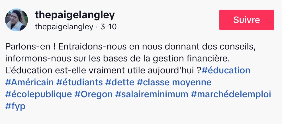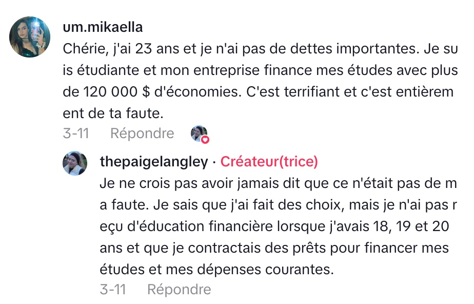 Paige, connue sous le pseudo @thepaigelangley, a secoué les réseaux en révélant le montant colossal de sa dette : près de 180 000 $ accumulés à travers ses études et ses dépenses de base. À 24 ans, encore chez ses parents, elle constate que ses cinq années d’université rythmées par des cours d’été et plusieurs emplois ne lui ont rapporté que très peu d’aides non remboursables. Son endettement combine prêts étudiants, prêt auto et cartes de crédit.