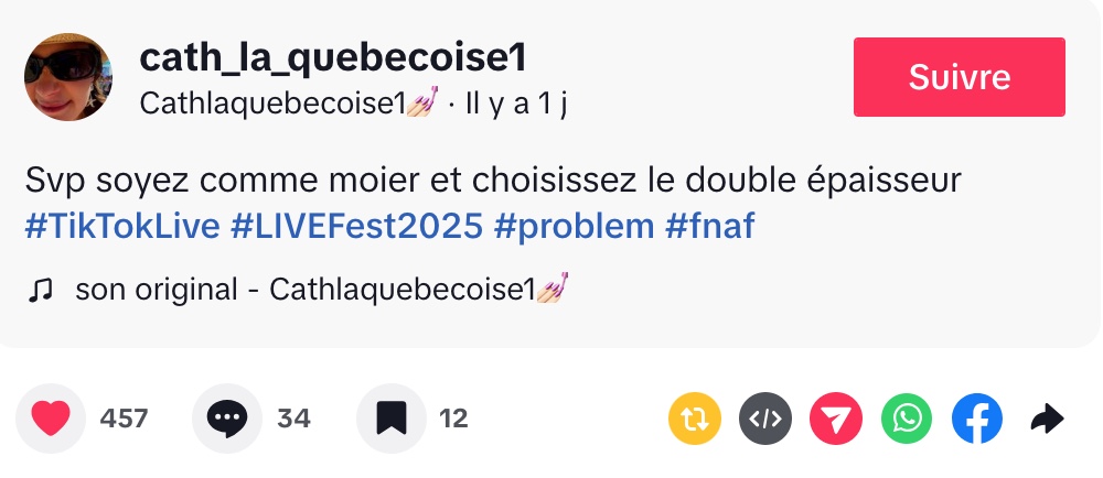 @cath_la_quebecoise1 Svp soyez comme moier et choisissez le double épaisseur #TikTokLive #LIVEFest2025 #problem #fnaf ♬ son original – Cathlaquebecoise1💅🏻