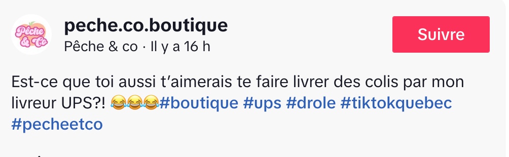 @peche.co.boutique Est-ce que toi aussi t’aimerais te faire livrer des colis par mon livreur UPS?! 😂😂😂#boutique #ups #drole #tiktokquebec #pecheetco ♬ Typing sound (keyboard) 1 minute(1006555) – LEOPARD