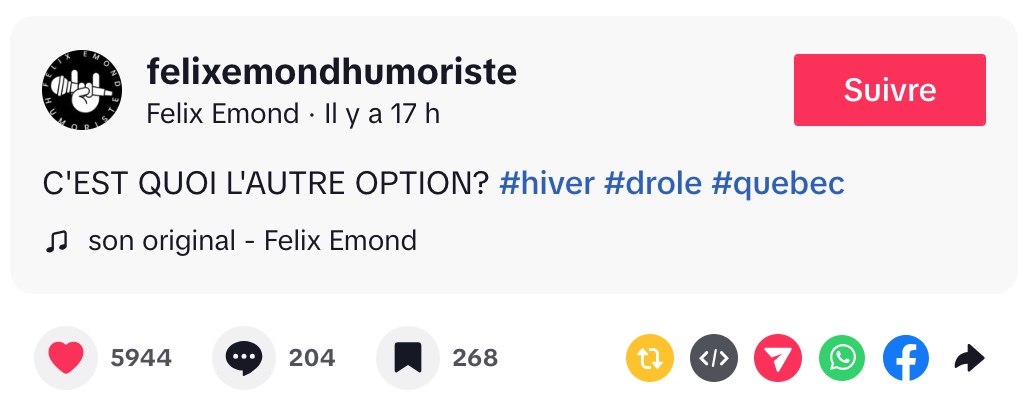 @felixemondhumoriste C’EST QUOI L’AUTRE OPTION? #hiver #drole #quebec ♬ son original – Felix Emond