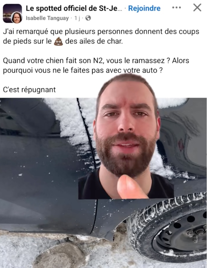 Dans sa vidéo TikTok, Félix réagit avec son ton ironique à un commentaire qui a fait sourciller bien des gens. Le commentaire en question compare la neige sale accumulée sur les ailes de voiture au caca de chien, reprochant aux automobilistes de ne pas la ramasser. Félix lit le message à voix haute, visiblement incrédule, puis démonte l’argument avec sarcasme.
