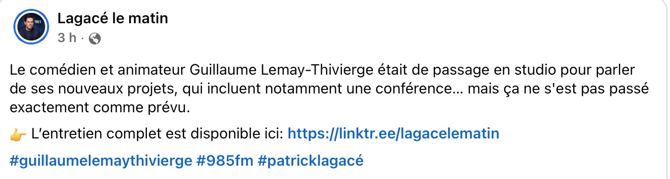@985fmLe comédien et animateur Guillaume Lemay-Thivierge était de passage en studio pour parler de ses nouveaux projets, qui incluent notamment une conférence… mais ça ne s’est pas passé exactement comme prévu. 👉 L’entretien complet est disponible dans le lien en bio #guillaumelemaythivierge #985fm #patricklagacé
