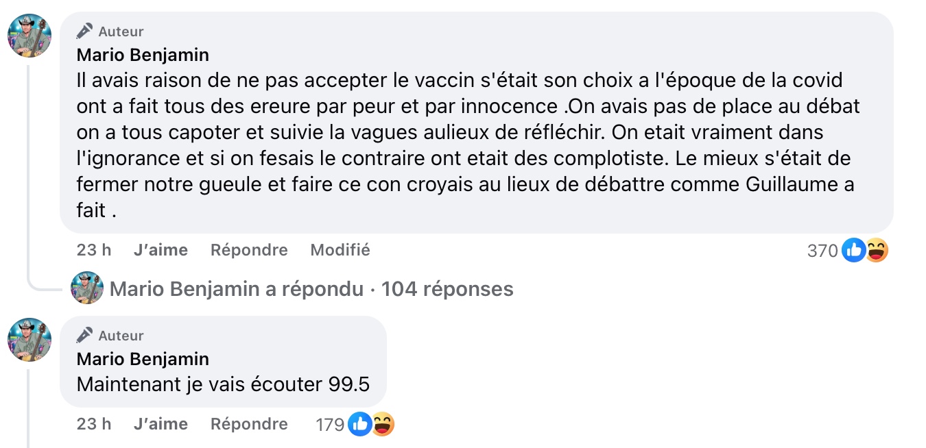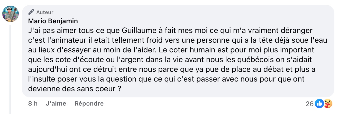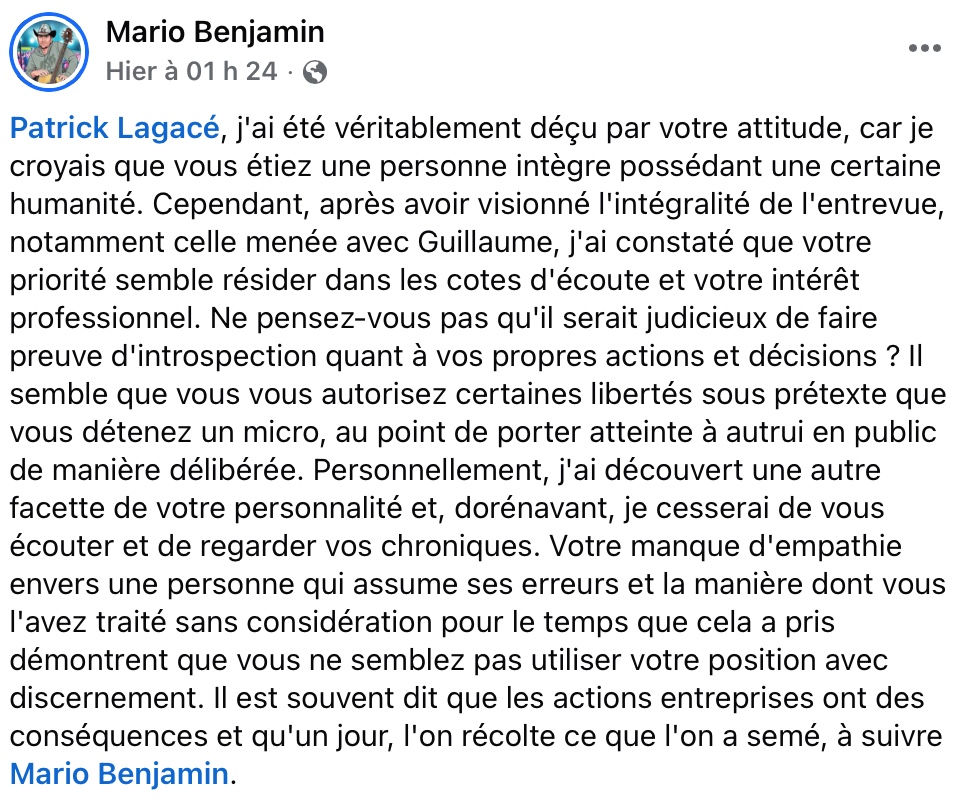 Dans ses propos, il remet en question l’usage du micro comme outil de pouvoir, estimant que certaines libertés prises en ondes peuvent devenir blessantes lorsqu’elles sont exercées sans empathie. Il reproche particulièrement le manque de considération envers Guillaume Lemay-Thivierge, qu’il perçoit comme un homme assumant ses erreurs et les conséquences qui en découlent. Pour Mario Benjamin, la manière dont l’entrevue a été menée démontre un manque de discernement et d’introspection.