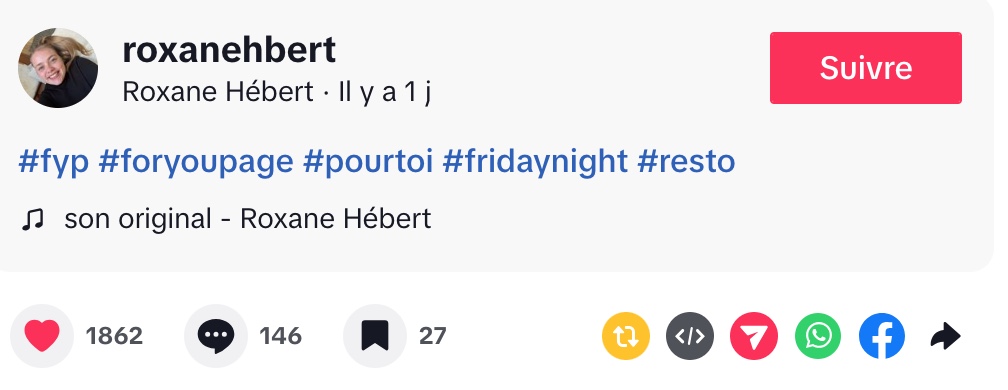 @roxanehbert #fyp #foryoupage #pourtoi #fridaynight #resto ♬ son original – Roxane Hébert