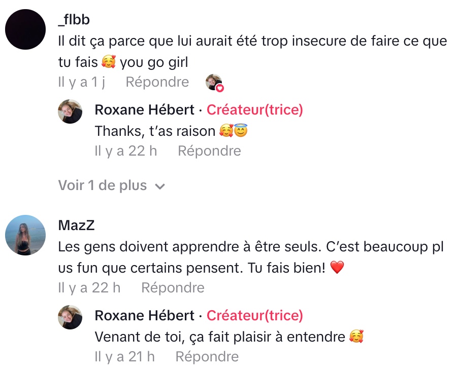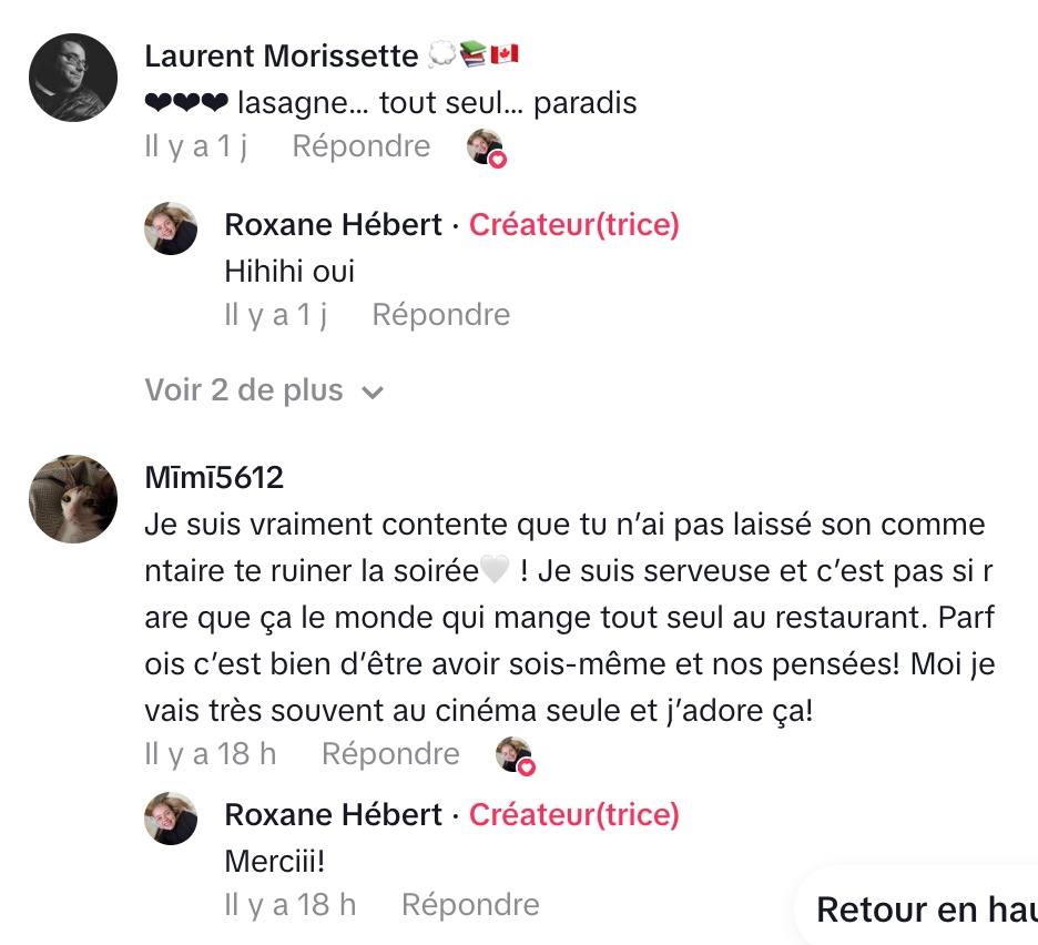 Plutôt que de se laisser atteindre, elle choisit l’humour et pousse la situation encore plus loin en commandant un verre de lait avec sa lasagne, assumant pleinement son « étrangeté ». Le malaise du serveur devient évident lorsqu’il lui offre finalement son verre. Roxane conclut son récit avec assurance : elle avait faim, elle voulait une bonne lasagne, elle a mangé et elle est repartie satisfaite. Pour elle, le plaisir et l’autonomie n’ont pas besoin d’être validés par la présence des autres.