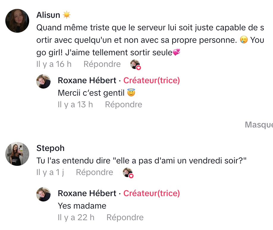 Rien d’extraordinaire, sauf qu’elle y va seule. À son arrivée, elle sent immédiatement le jugement du serveur, qui donne un coup de coude à son collègue, comme si le fait de souper seule signifiait automatiquement qu’elle n’a pas d’amis. Roxane souligne avec ironie l’absurdité de cette réaction : depuis quand manger seul est-il un problème ou un signe d’isolement social ?
