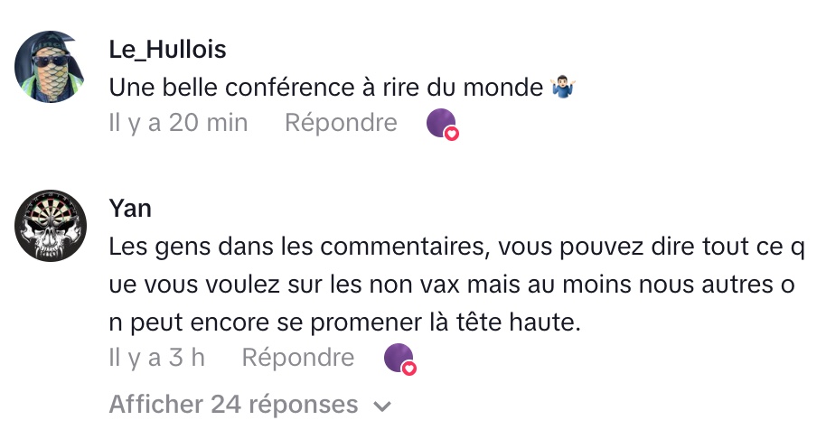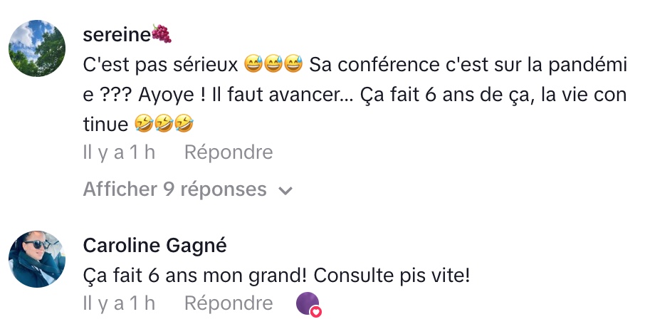 Dans l’extrait de sa conférence du 21 décembre, largement partagé sur TikTok, Guillaume Lemay-Thivierge revient longuement sur la période de la pandémie en utilisant un ton à la fois humoristique, provocateur et très personnel. Sur scène, il caricature les incohérences qu’il a perçues dans les mesures sanitaires, notamment le couvre-feu « après 8 h, sauf si t’as un chien », et l’arrivée rapide des vaccins. En comparant la situation à un gag du film Spaceballs, il exprime son étonnement face à la vitesse de développement d’un vaccin qu’on disait sécuritaire alors que, selon lui, ce genre de processus prend habituellement des années.