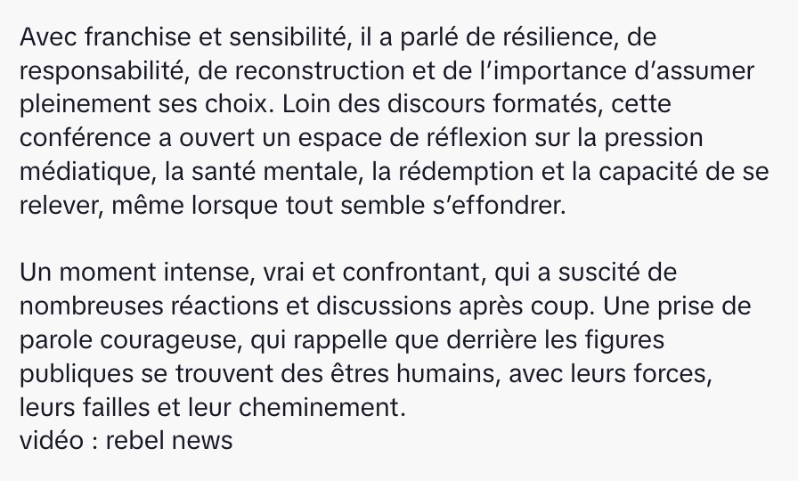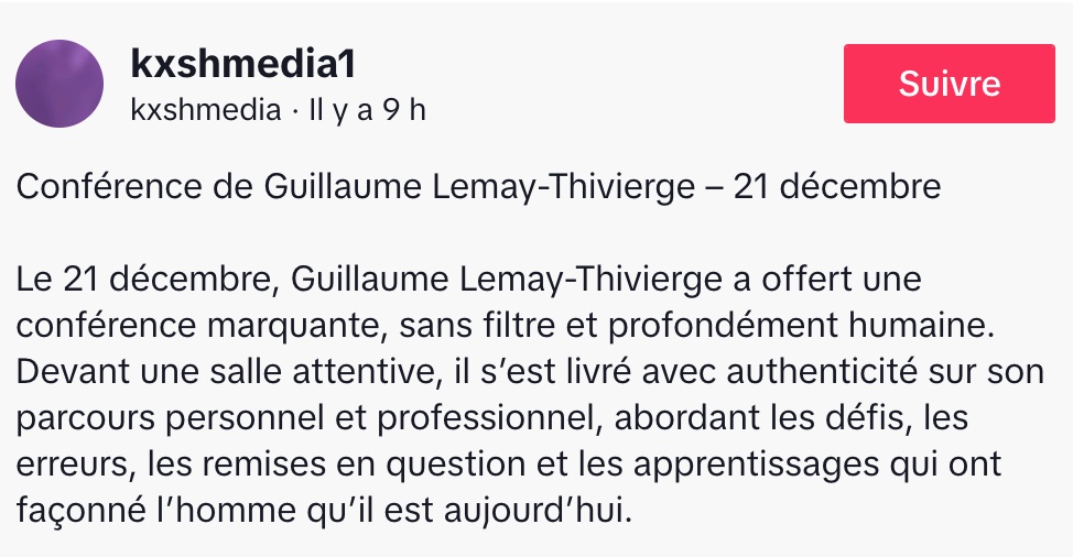 @kxshmedia1 Conférence de Guillaume Lemay-Thivierge – 21 décembre Le 21 décembre, Guillaume Lemay-Thivierge a offert une conférence marquante, sans filtre et profondément humaine. Devant une salle attentive, il s’est livré avec authenticité sur son parcours personnel et professionnel, abordant les défis, les erreurs, les remises en question et les apprentissages qui ont façonné l’homme qu’il est aujourd’hui. Avec franchise et sensibilité, il a parlé de résilience, de responsabilité, de reconstruction et de l’importance d’assumer pleinement ses choix. Loin des discours formatés, cette conférence a ouvert un espace de réflexion sur la pression médiatique, la santé mentale, la rédemption et la capacité de se relever, même lorsque tout semble s’effondrer. Un moment intense, vrai et confrontant, qui a suscité de nombreuses réactions et discussions après coup. Une prise de parole courageuse, qui rappelle que derrière les figures publiques se trouvent des êtres humains, avec leurs forces, leurs failles et leur cheminement. vidéo : rebel news #Conference #ParlerVrai #Resilience #Reconstruction #santémentale ♬ original sound – kxshmedia