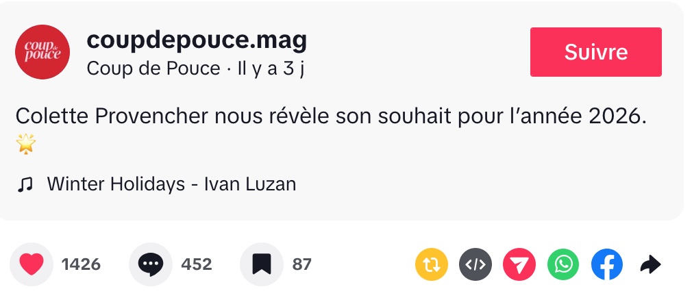 @coupdepouce.magColette Provencher nous révèle son souhait pour l’année 2026.🌟♬ Winter Holidays – Ivan Luzan
