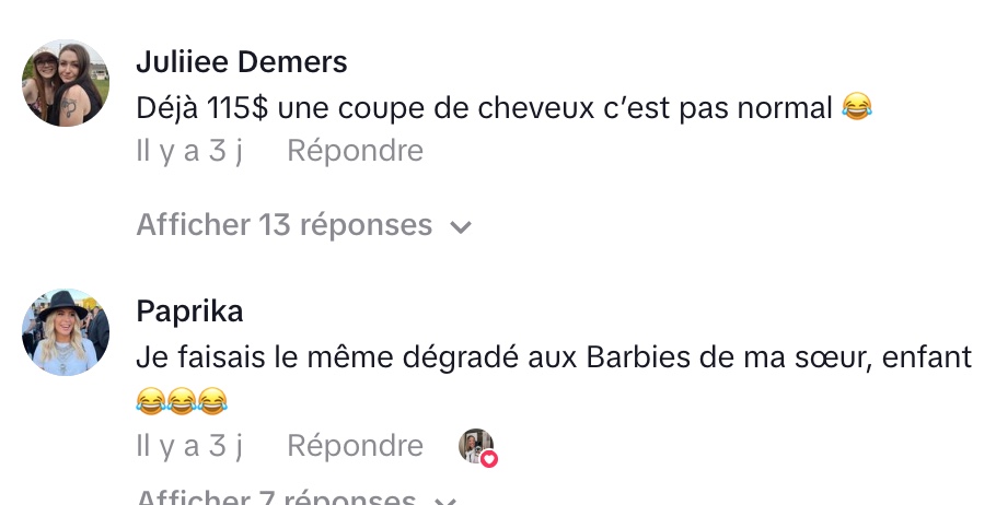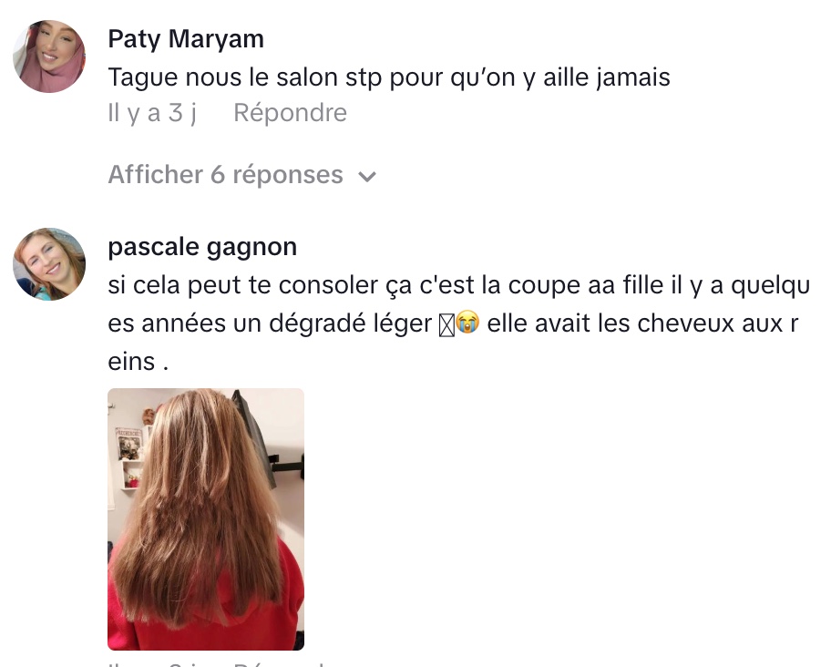 Amira partage dans sa vidéo TikTok une expérience frustrante vécue dans un salon de coiffure à Québec. Elle raconte s’être rendue dans le salon pour se faire couper les cheveux et demander un dégradé, payant 115 $ pour le service. Sur place, tout semblait correct, et elle a même pensé que la coupe était parfaite. Cependant, une fois chez elle et après avoir lavé ses cheveux, elle a constaté que le dégradé n’était pas uniforme et que des couches apparentes donnaient un résultat qu’elle jugeait « laid ».